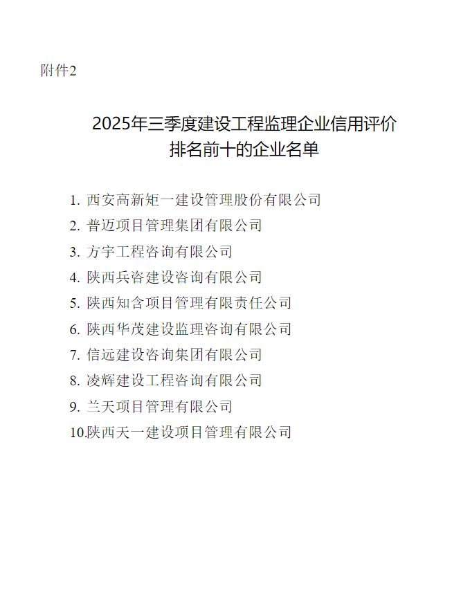 2.2025年三季度建设工程监理企业信用评价排名前十的企业名单