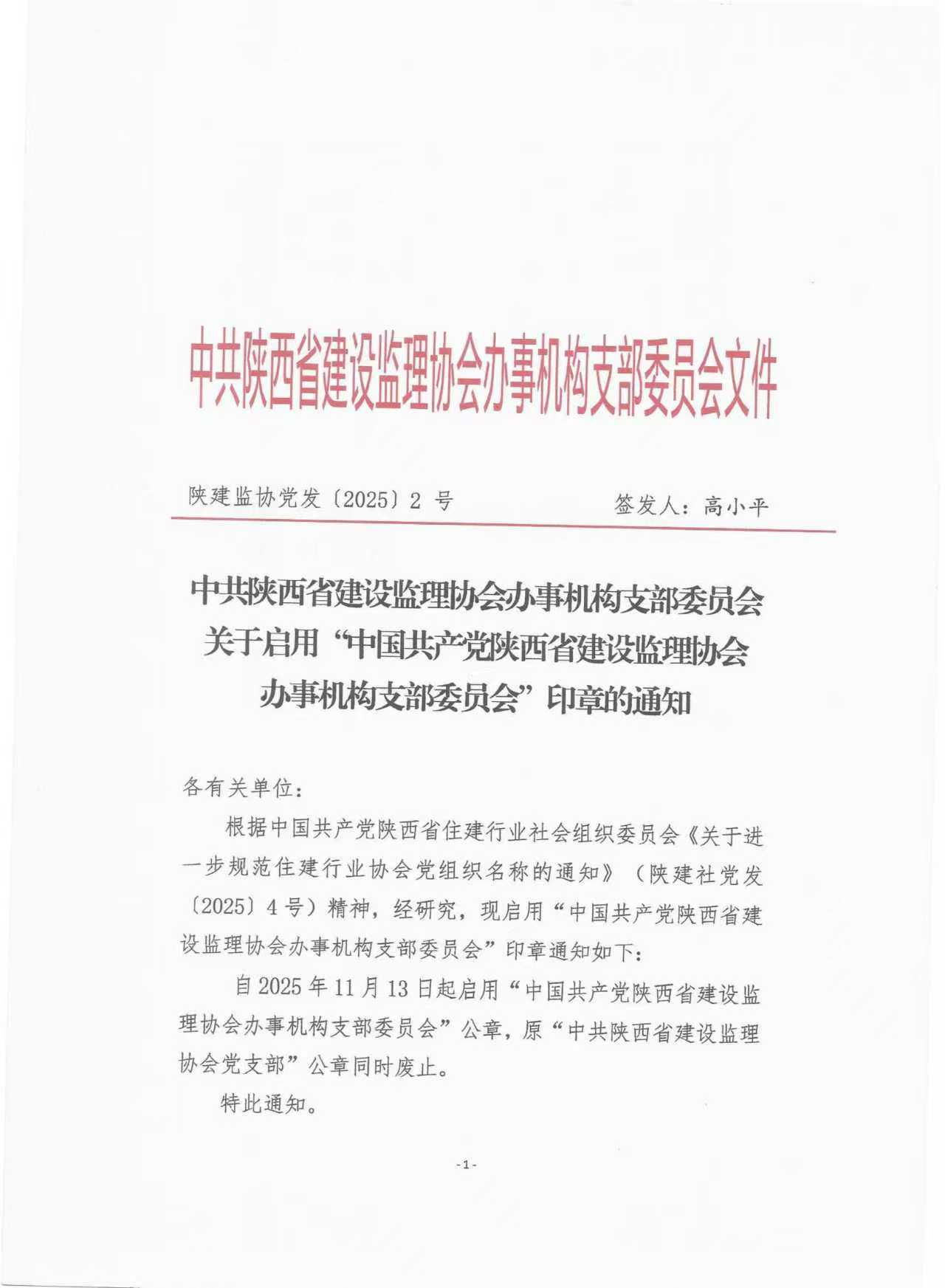 关于启用“中国共产党陕西省建设监理协会办事机构支部委员会”印章的通知