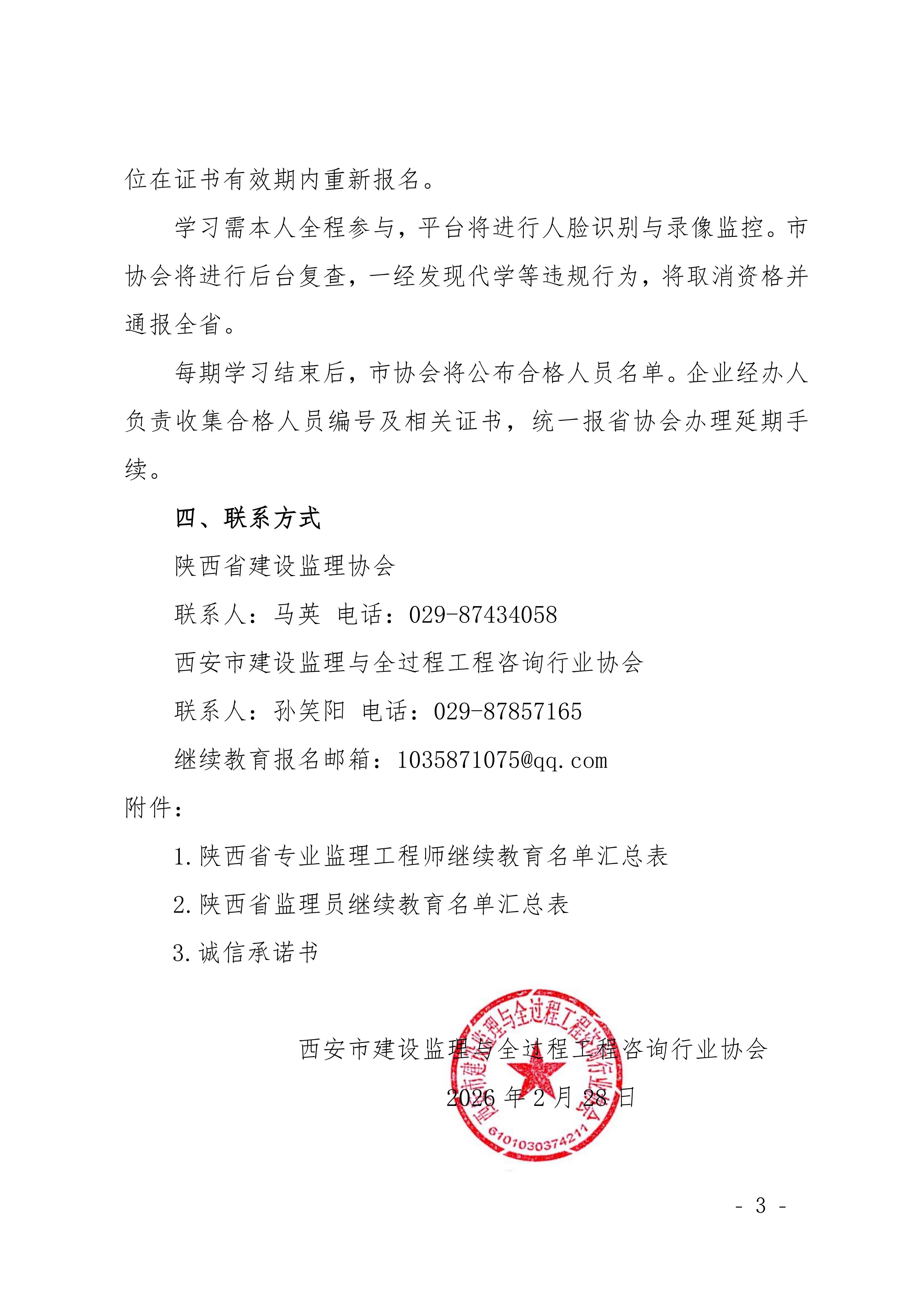 陕西省专业监理工程师、陕西省监理员继续教育通知转发各监理企业,各监理企业根据通知要求结合单位工作安排组织相关人员报名参加。请各有关单位按西安市建设监理与全过程工程咨询行业协会印发的《关于开展2026年陕西省专业监理工程师、 陕西省监理员线上继续教育的通知》(文件链接:https://www.xajsjlxh.com/#/Details?id=498&categoryName=%E6%96%87%E4%BB%B6%E9%80%9A%E7%9F%A5)文件要求准备资料,在规定时间内上报。