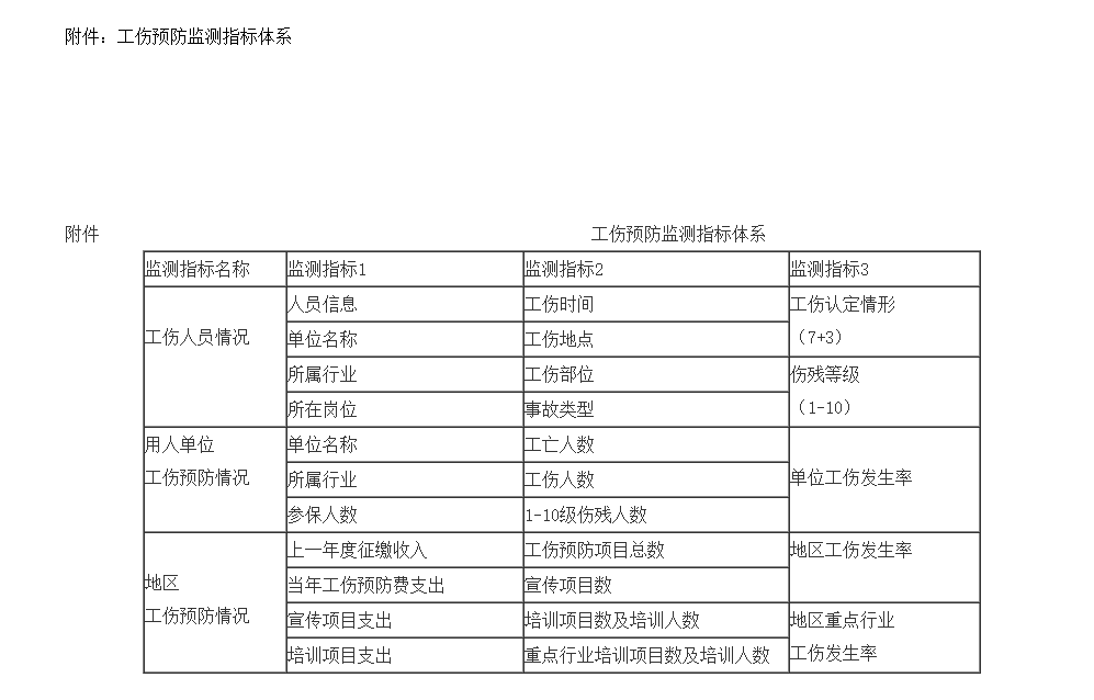 (八)建立完善工伤事故(含职业病)监测指标体系。各地要构建工伤事故动态微观数据集,系统归集积累用人单位参保人数(行业类型分布)、工伤认定数(事故类型分布)、劳动能力鉴定数(伤残等级分布)、基金支付数据以及工伤预防费使用等数据;加强数据开发和分析应用,掌握工伤事故和职业病发生规律(高频原因、岗位、地点)、行业工伤事故发生率、企业工伤事故发生率、工伤预防开展情况及预防费使用率、基金支缴率等指标,加强对重点行业、重点企业、重点岗位的工伤事故和职业病的监测分析与风险预警,为精准开展工伤预防、科学浮动费率、完善政策提供科学依据。