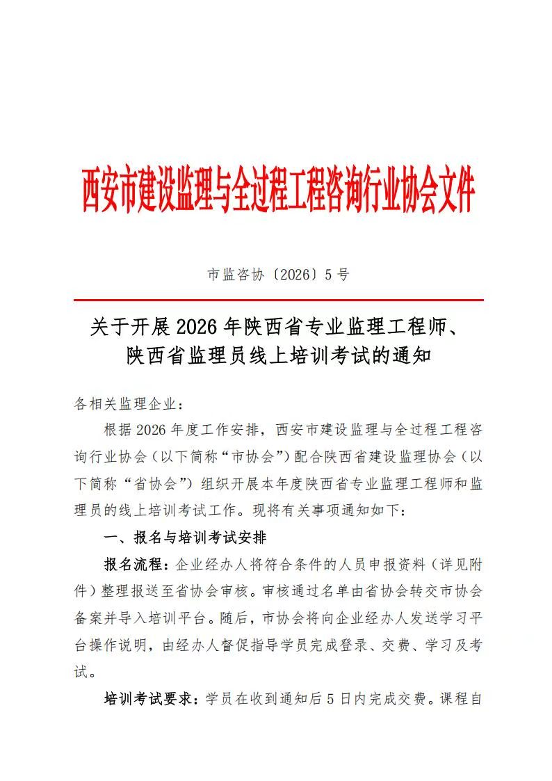 2026年度新报陕西省专业监理工程师、监理员业务将于2026年4月8日开始审核资料,请各有关单位按西安市建设监理与全过程工程咨询行业协会印发的《关于开展2026年陕西省专业监理工程师、监理员线上培训考试的通知》(文件链接:https://www.xajsjlxh.com/#/Details?id=505&categoryName=%E6%96%87%E4%BB%B6%E9%80%9A%E7%9F%A5&ccId=70)文件要求准备资料。