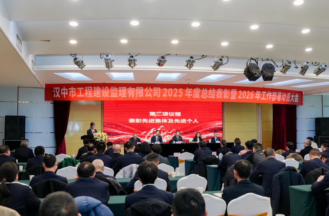 春启新程,万象更新。2月6日下午,汉中市工程建设监理有限公司召开2025年度总结表彰暨2026年工作部署动员大会。公司党支部书记、总经理魏涛,工会主席、总经济师赵亚谊,副总经理罗银辉,总工程师苏昕,技术委员会顾问侯文彬出席会议,公司各职能部门、分公司全体人员,直属监理部负责人及受表彰的先进集体和先进个人齐聚一堂,共忆奋斗历程、共话发展蓝图。会议由总经理助理、办公室主任王苗主持。