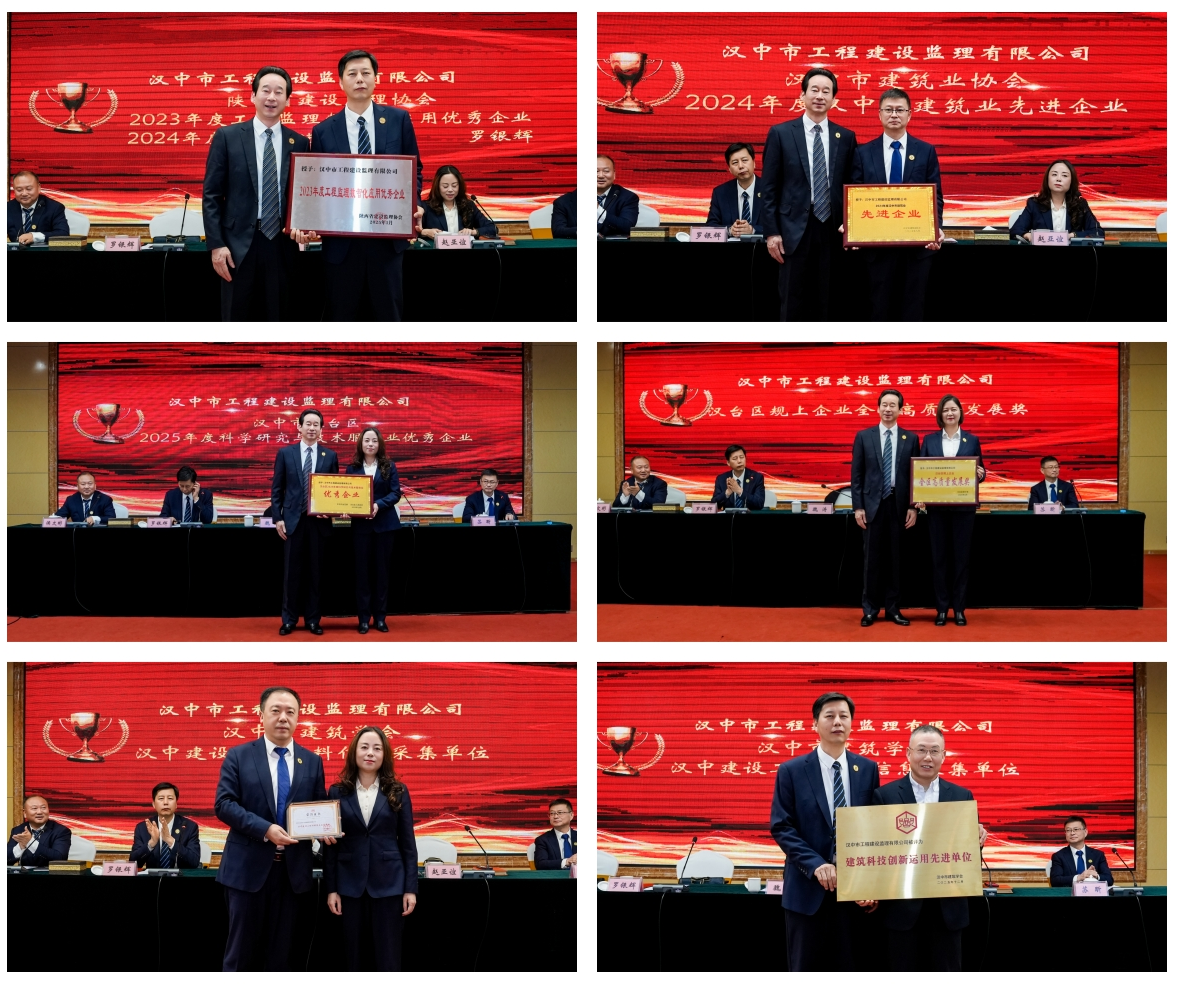 表彰环节气氛热烈,掌声雷动。会议首先通报了公司及个人斩获的14项外部荣誉,涵盖行业认证、地方表彰、个人殊荣三大类。其中,公司先后获评 “陕西省工程监理数智化应用优秀企业”“汉中市建筑业先进企业”“汉台区科学研究与技术服务业优秀企业” 等6项集体荣誉,监理的天汉大剧院项目成功斩获市级最高优质工程“天汉杯”奖;个人层面,总经理魏涛获评 “汉中市建筑业优秀企业家”,副总经理罗银辉获评 “陕西省建设监理协会先进工作者”,技术顾问侯文彬获评“汉中市建筑业优秀总工程师”,齐文韬同志被中共汉中市委授予“天汉英才”称号,詹坤同志在第二届全国工程监理行业知识竞赛陕西赛区斩获第一名并晋级全国决赛,刘庆华等4人获评“汉中市建筑业优秀监理工程师”,齐文韬、谷红兵获评“优秀调解员”。每一项荣誉都彰显了“汉中监理” 的专业实力与行业口碑,是全体员工攻坚克难的生动写照。