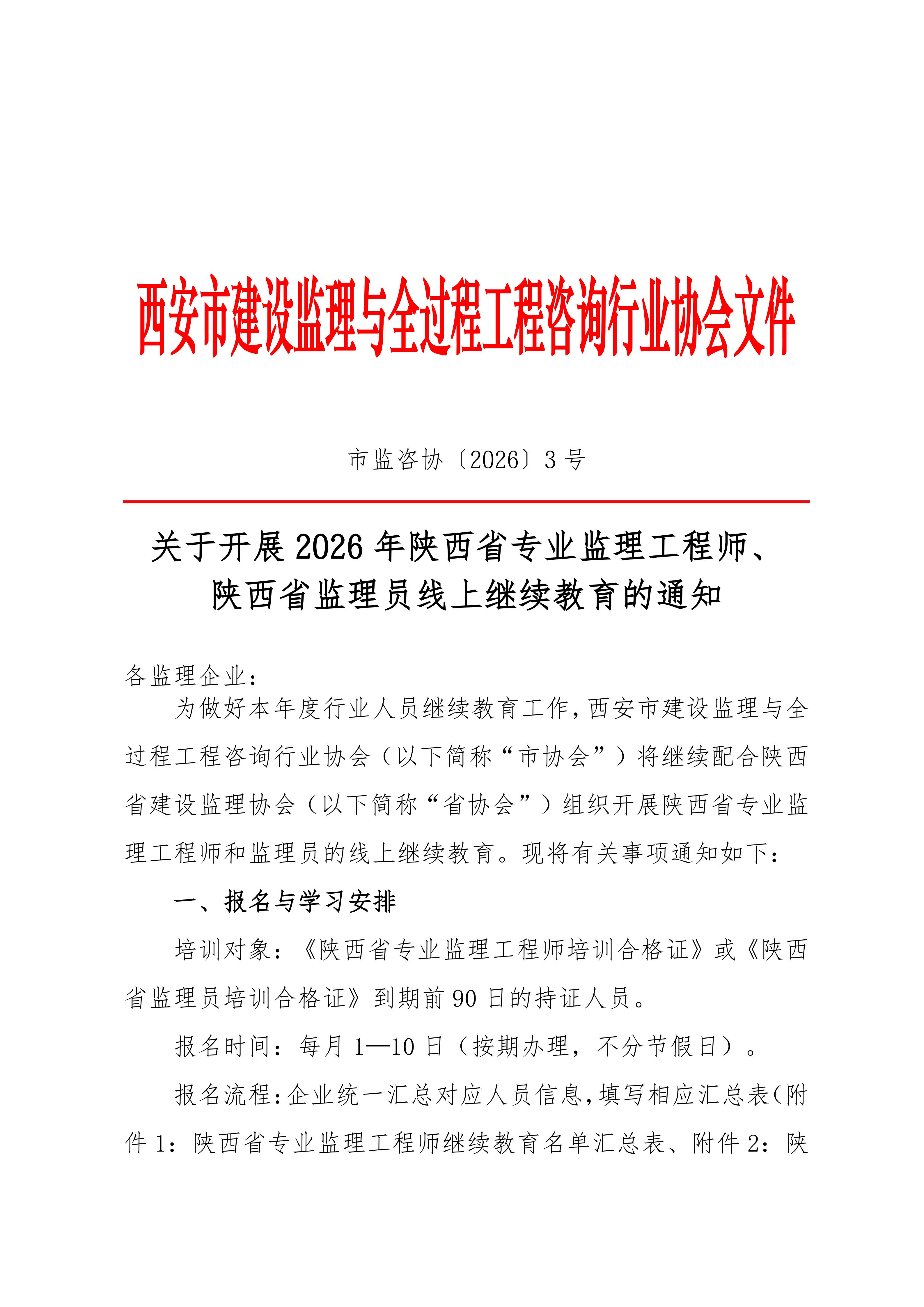 陕西省专业监理工程师、陕西省监理员继续教育通知转发各监理企业,各监理企业根据通知要求结合单位工作安排组织相关人员报名参加。请各有关单位按西安市建设监理与全过程工程咨询行业协会印发的《关于开展2026年陕西省专业监理工程师、 陕西省监理员线上继续教育的通知》(文件链接:https://www.xajsjlxh.com/#/Details?id=498&categoryName=%E6%96%87%E4%BB%B6%E9%80%9A%E7%9F%A5)文件要求准备资料,在规定时间内上报。